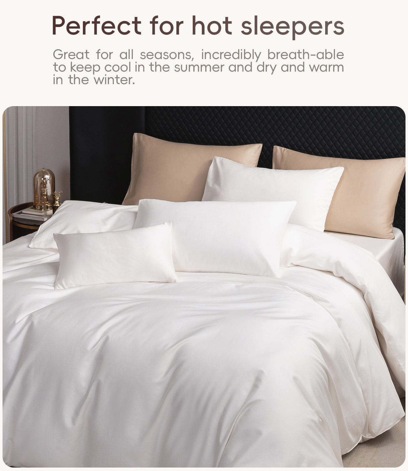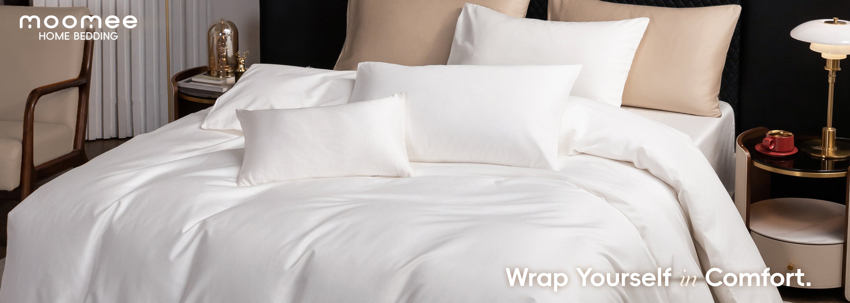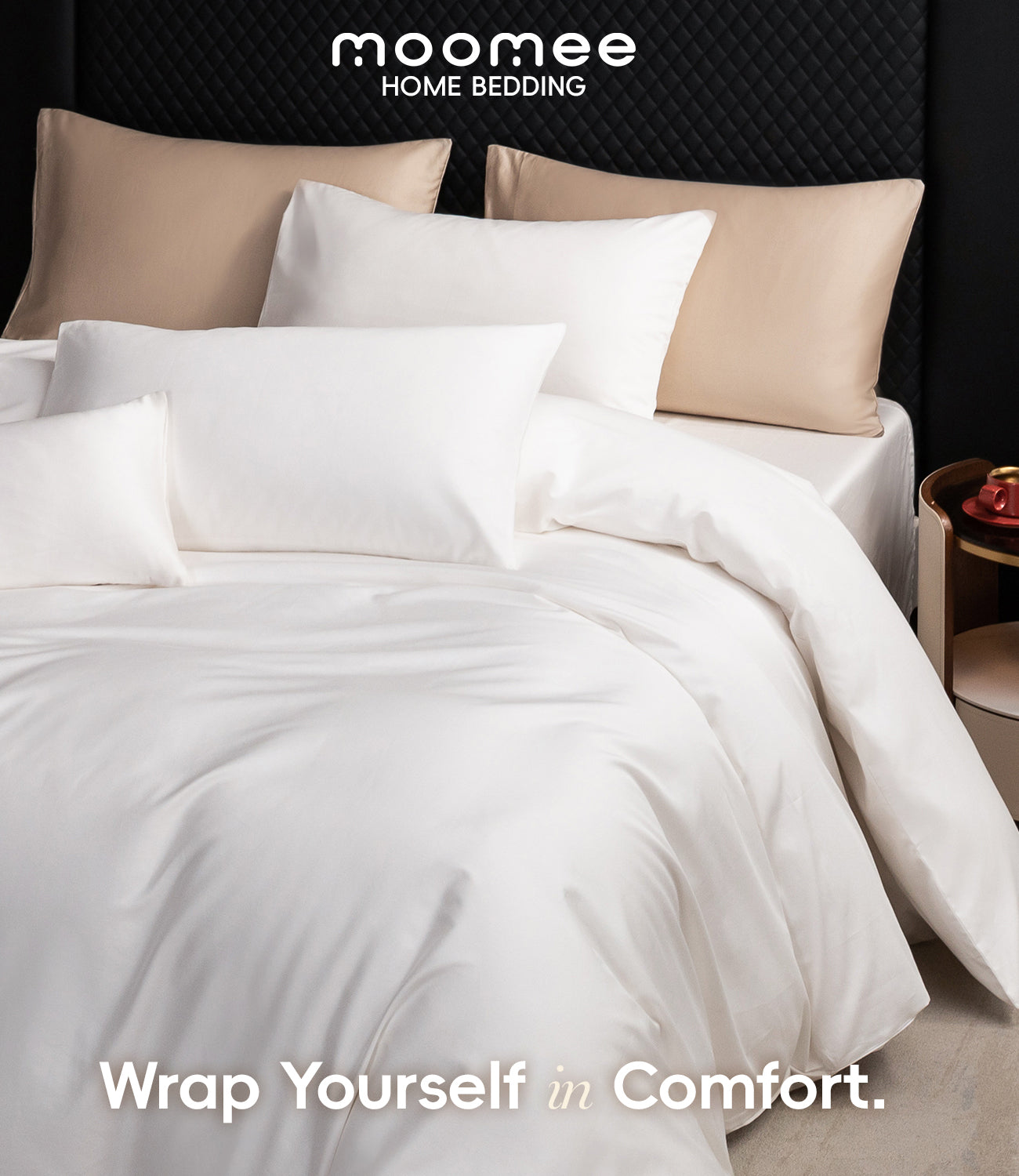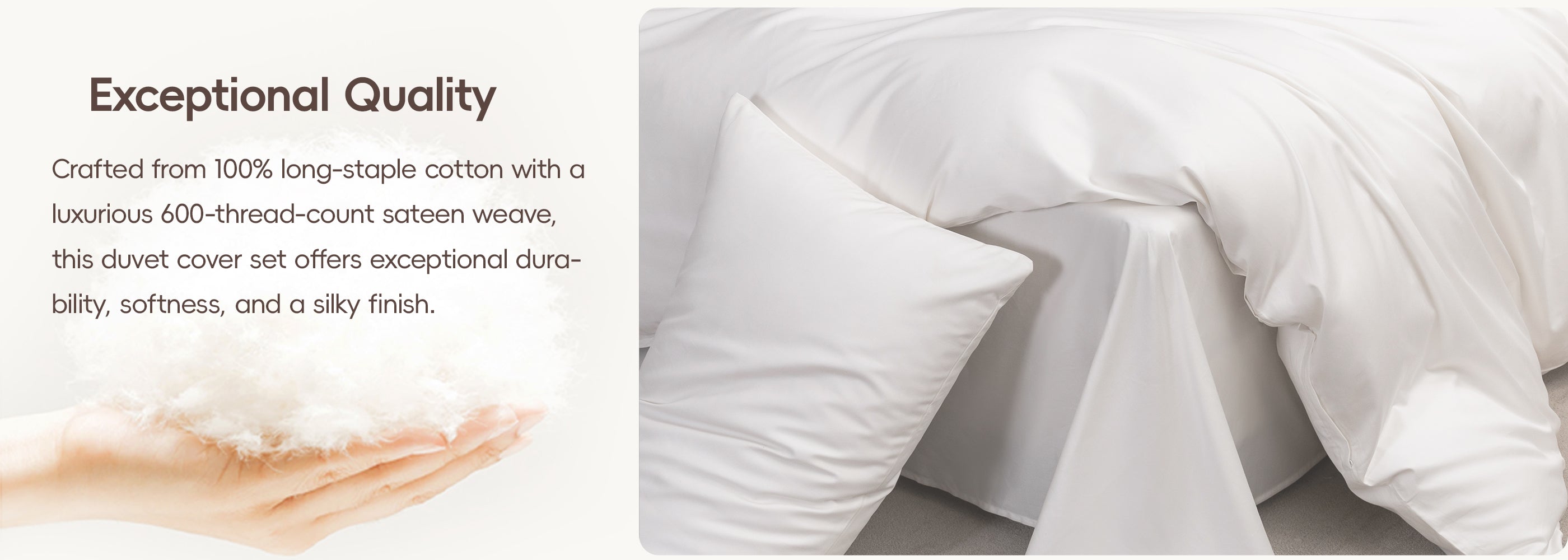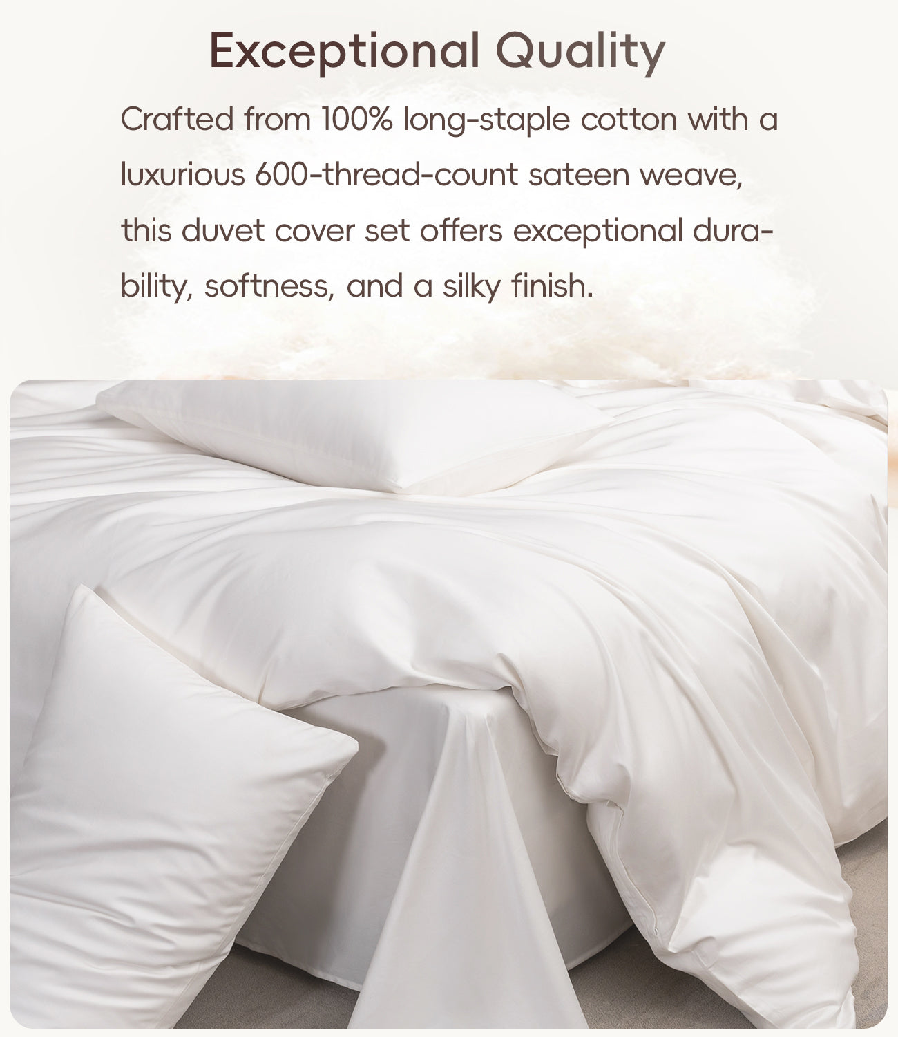 This MooMee Duvet Cover Set is made from 100% extra-long staple cotton with a luxurious 600-thread-count sateen weave, offering exceptional durability, softness, and a silky-smooth finish. Its sleek design effortlessly complements any decor, while thoughtful details like a hidden zip closure, 8 interior corner ties to keep your duvet securely in place, and envelope-closure pillowcases ensure both style and function.