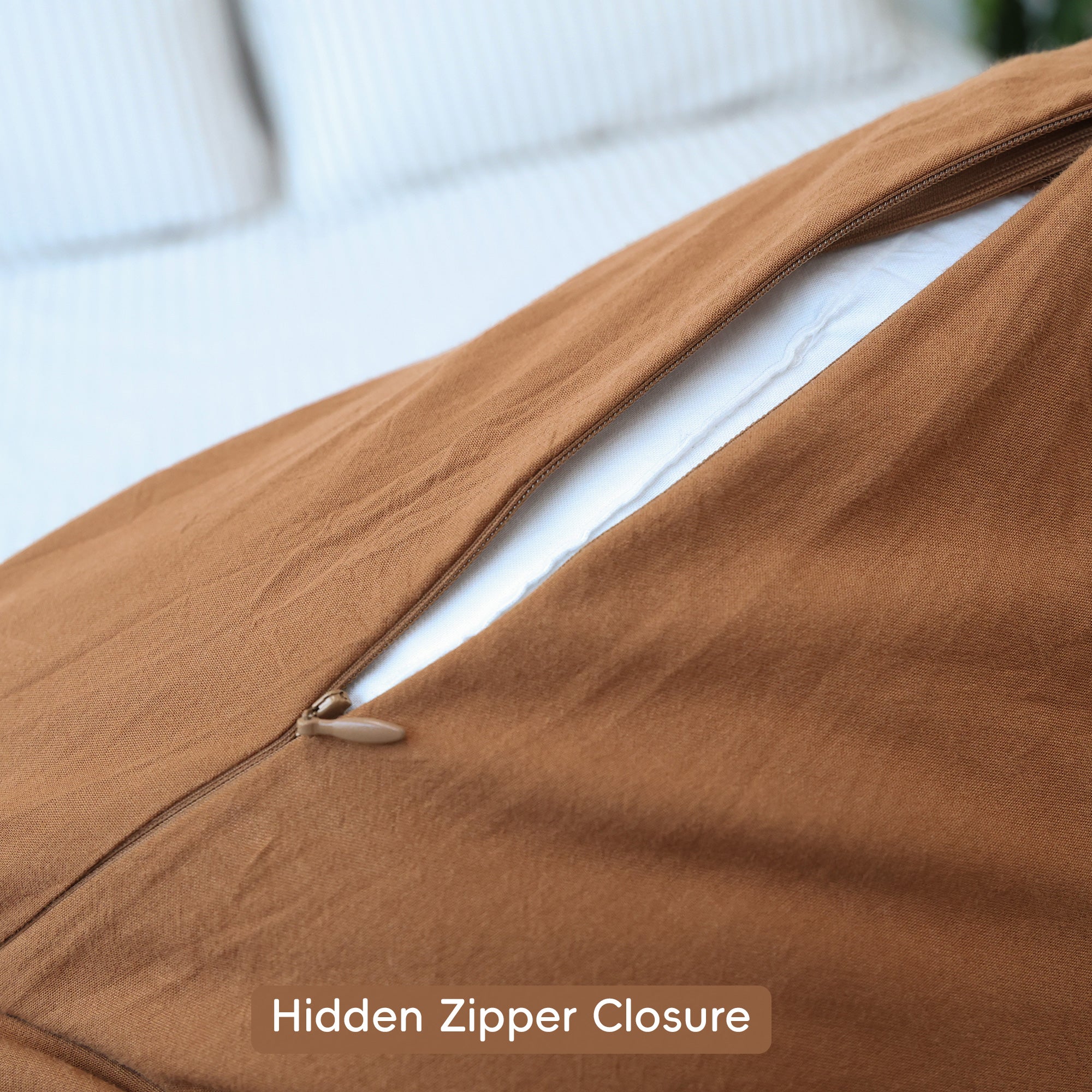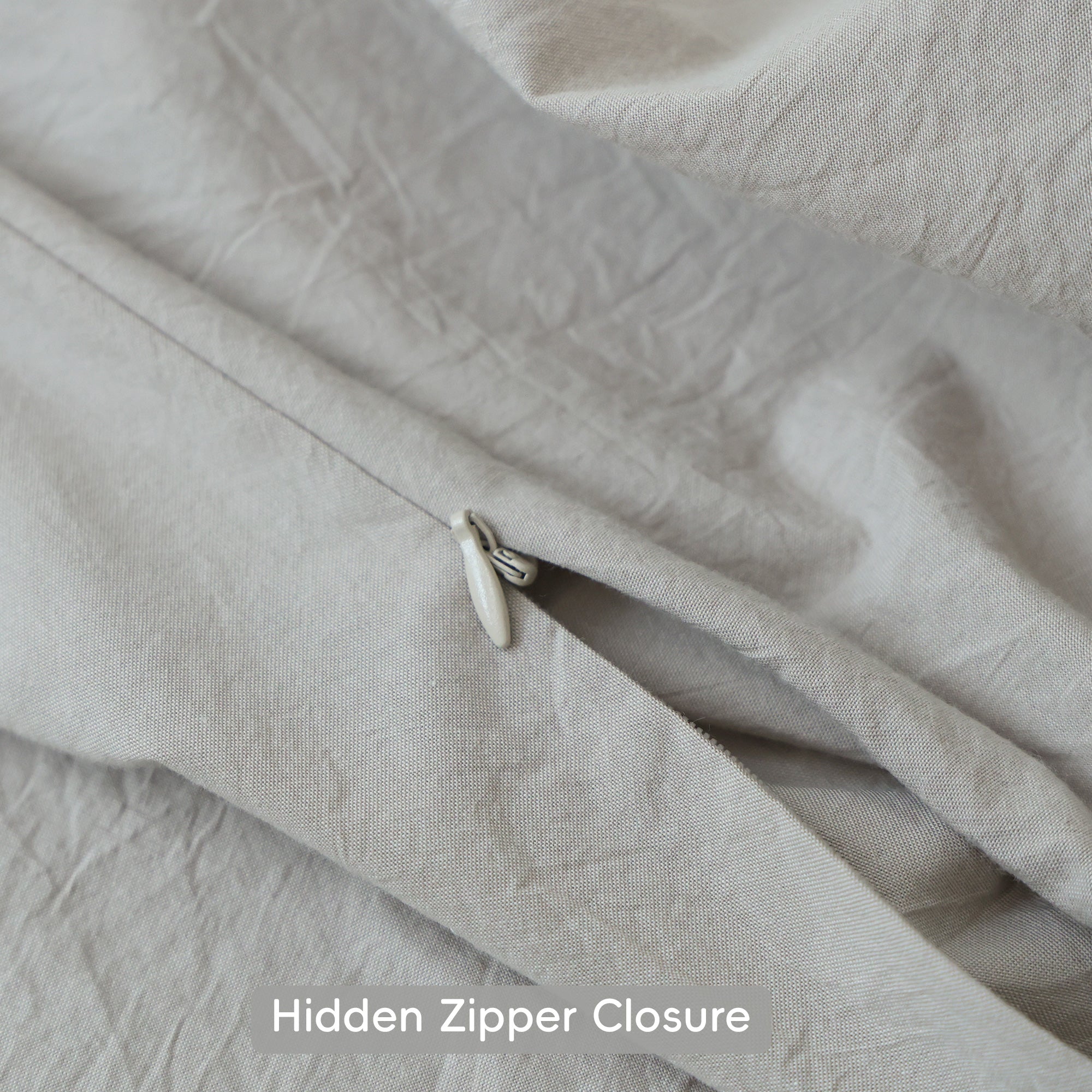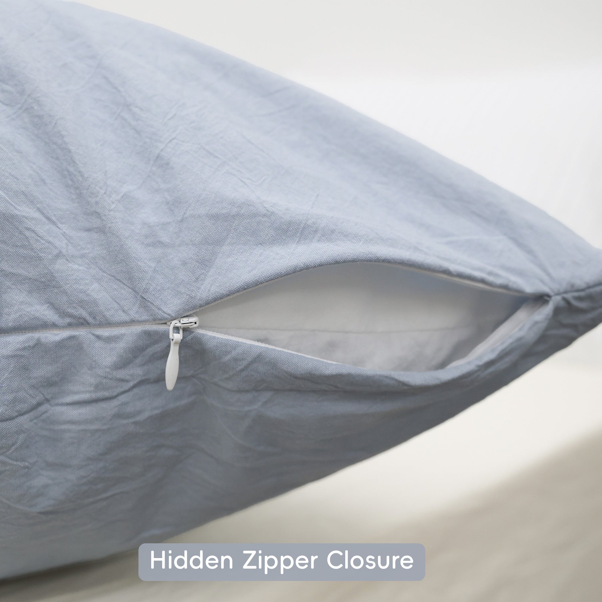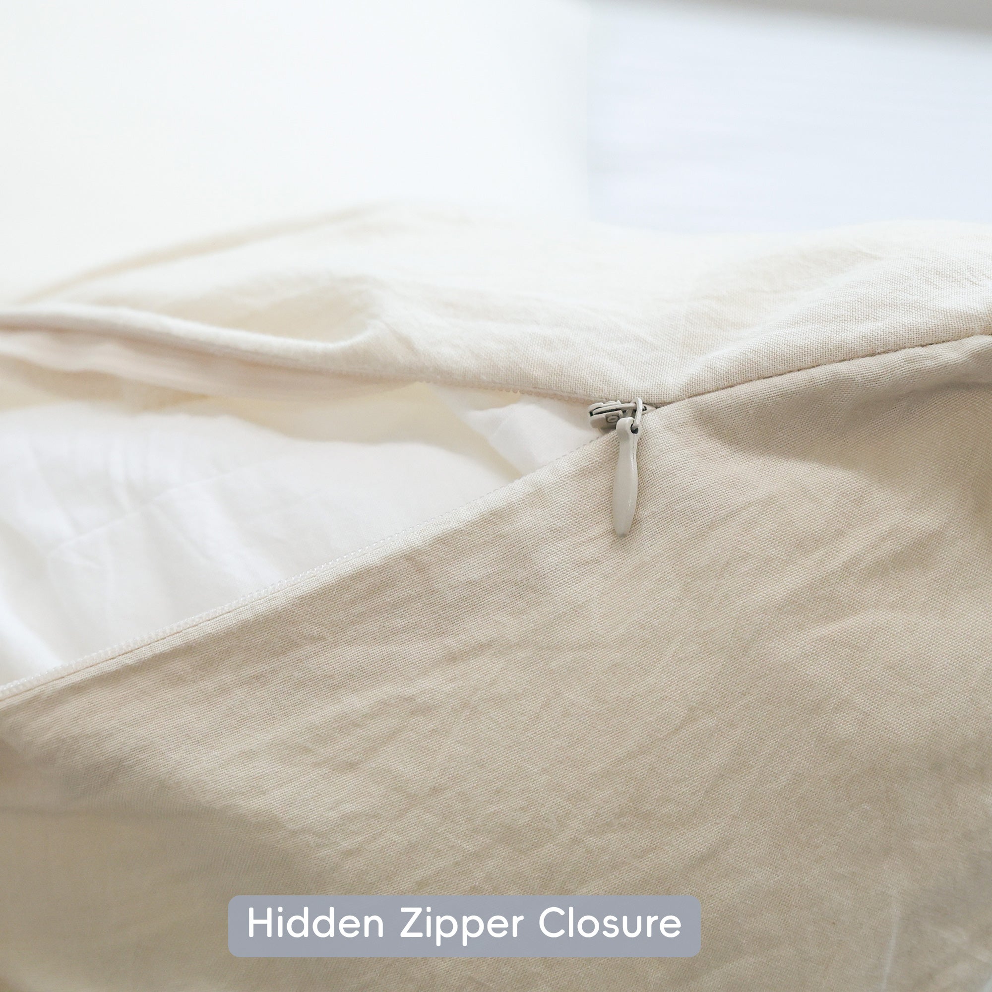 Made from 100% washed cotton with a slightly wrinkled texture, it combines the breathable feel of linen with the softness of cotton. Ideal for cozy nights, lounging, or adding a stylish touch to your bed. Finished with a hidden zipper for a neat look, available in versatile natural hues to match any bedding.